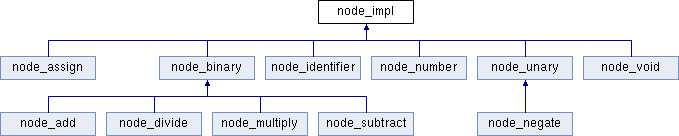 Implemented in node_divide, node_multiply, node_subtract, node_add, node_negate, node_binary, node_unary, node_assign, node_identifier, node_number, and node_void.
